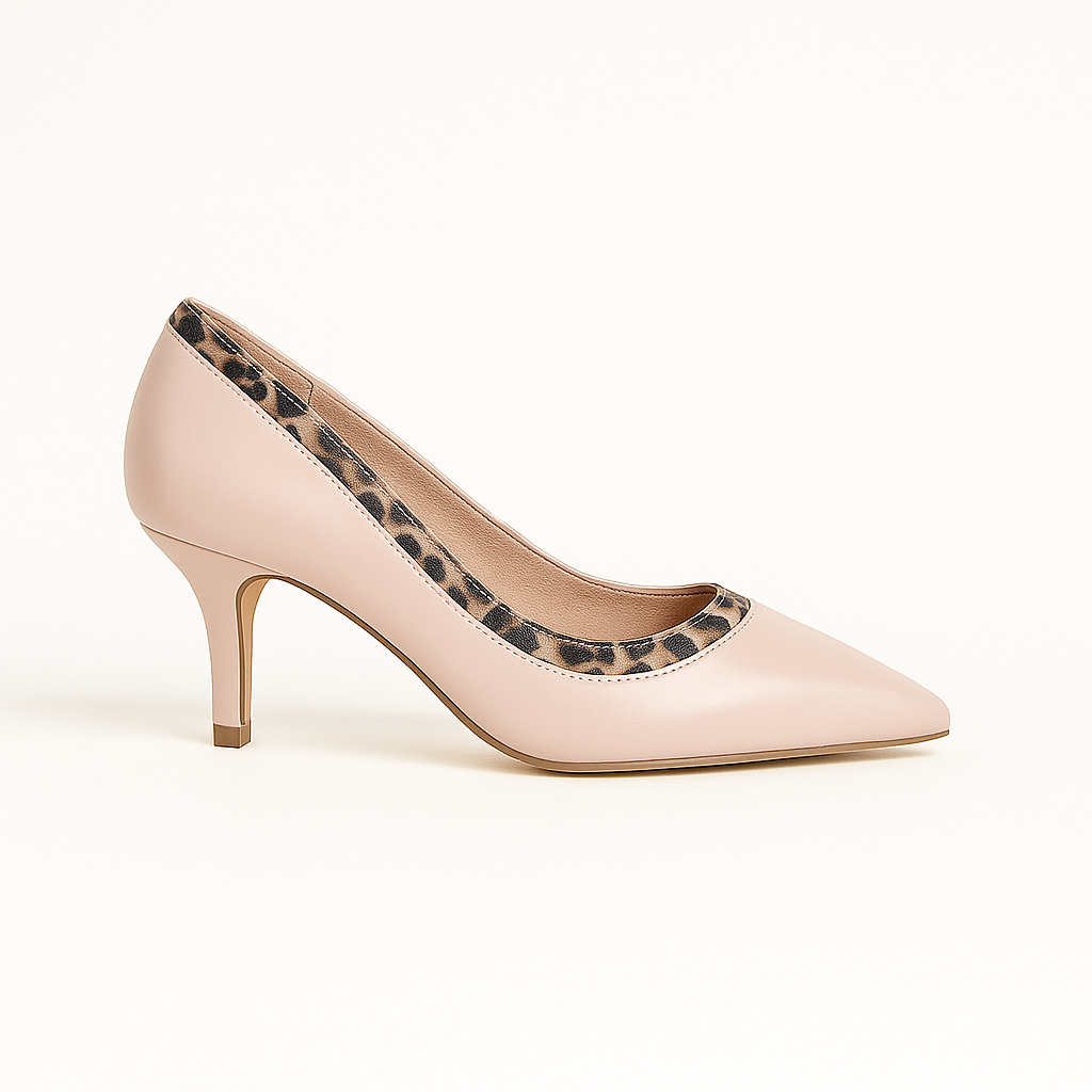 A classic with a wild twist. This chic court heel comes in a soft beige finish, accented with a bold leopard trim that adds instant personality. Designed with a mid-to-low heel, it offers comfort you can rely on while keeping your look effortlessly polished—perfect for workdays, dinners, and everything in between.